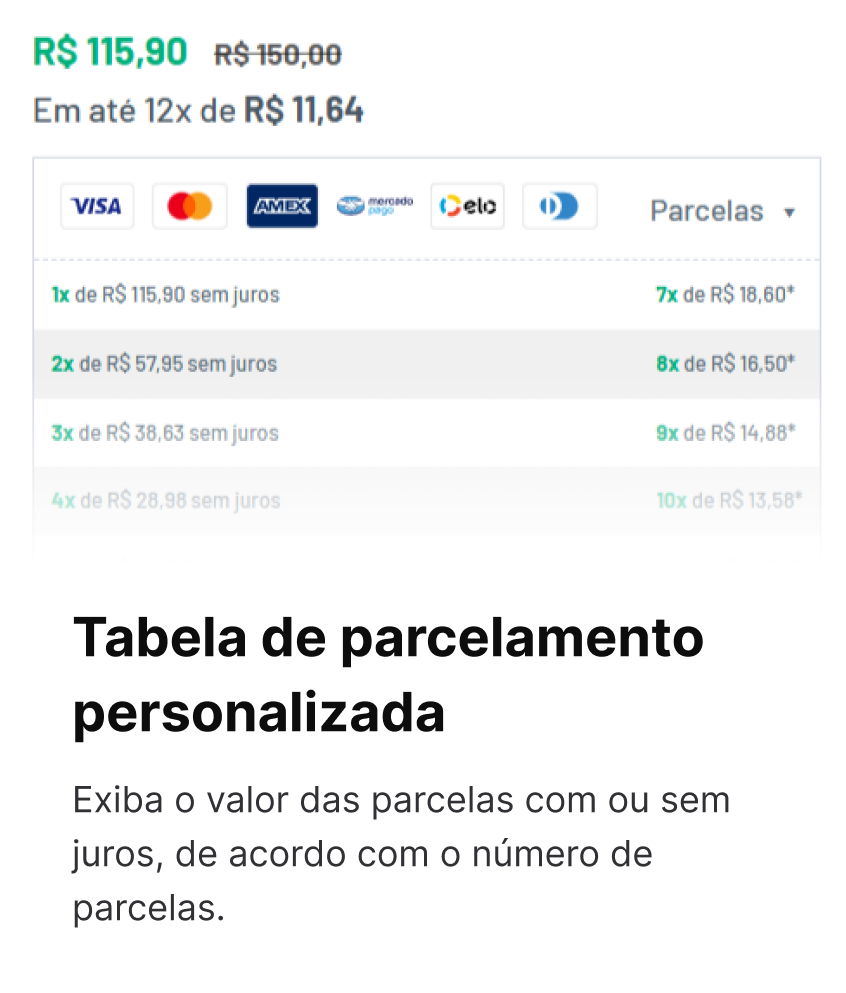Com o Parcelamento, adicione uma tabela de parcelamento personalizada abaixo do preço do produto, mostrando claramente o valor das parcelas, com ou sem juros, e facilite a decisão de compra dos seus clientes.